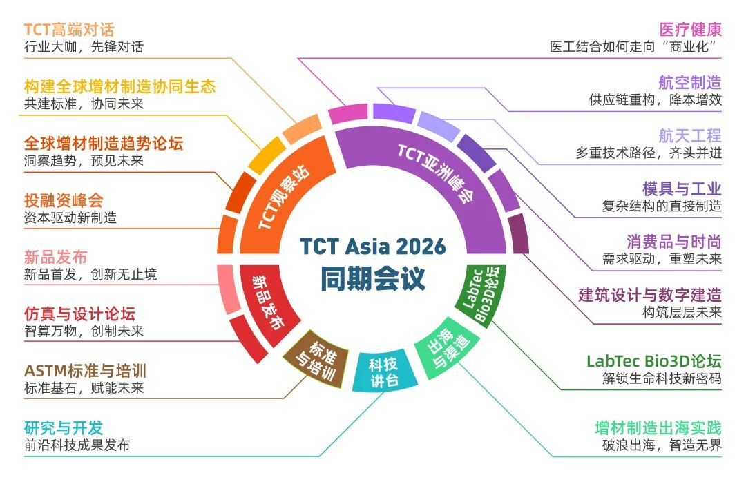 TCT Asia 2026将继续以“构建3D打印与增材思维”为主题,聚焦工业级设备与系统、功能材料与耗材、设计软件与扫描技术、医疗生物与科研应用,以及智能制造与自动化集成。