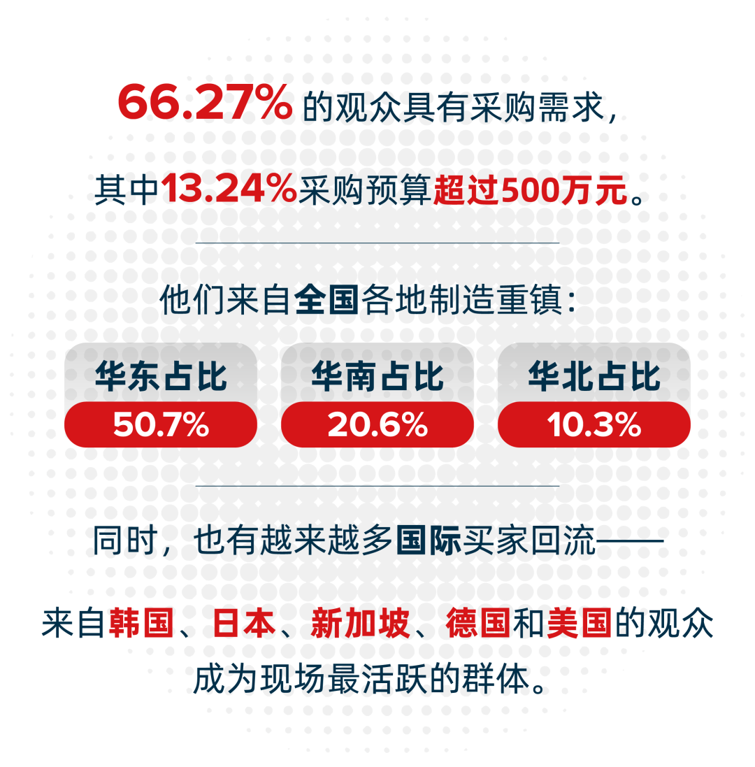 他们来自全国各大制造业重镇:华东地区占比50.7%,华南地区占比20.6%,华北地区占比10.3%。同时,来自韩国、日本、新加坡、德国及美国等国家的国际买家数量持续上升,成为展会现场最具活力的群体之一。