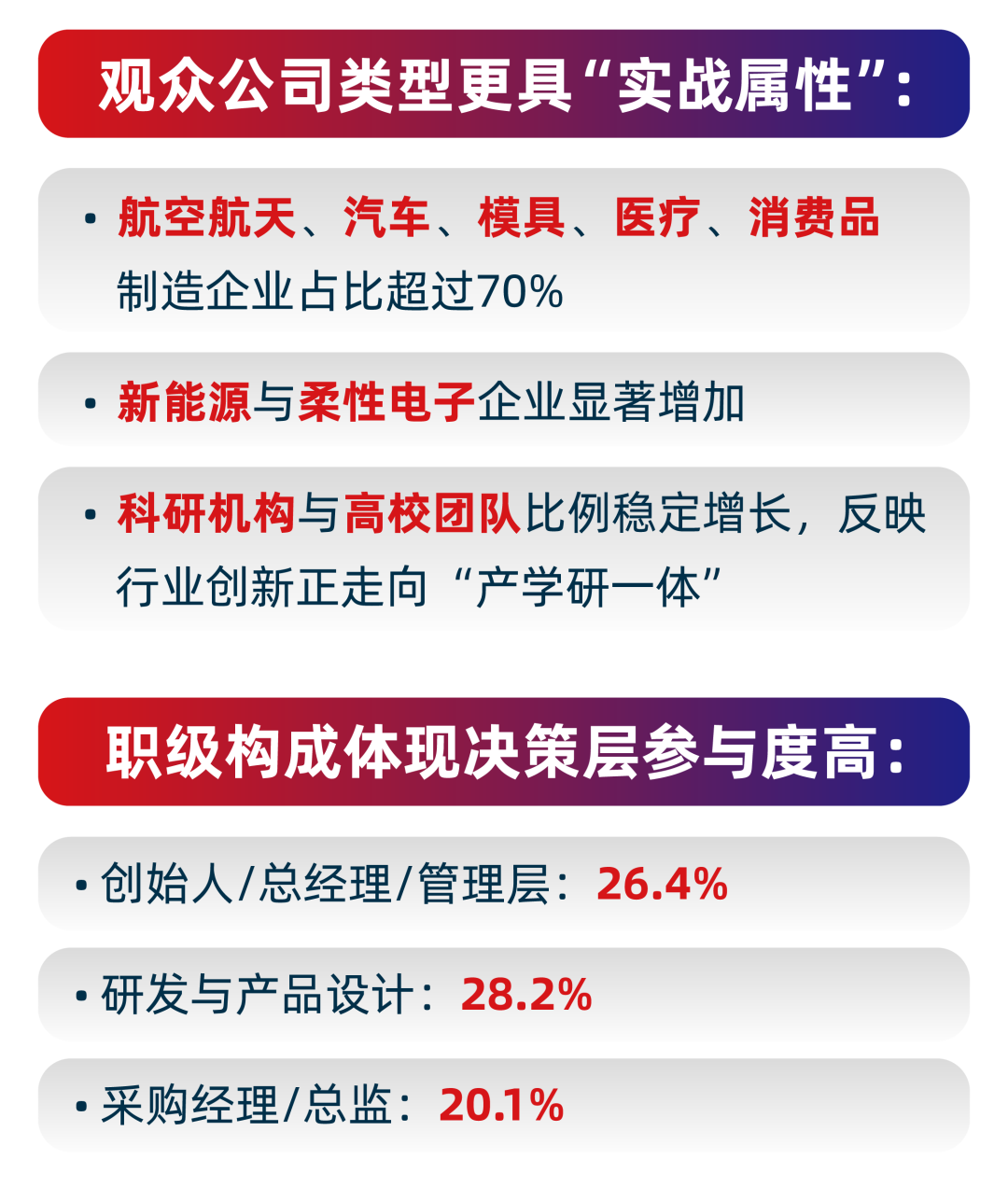 4大行业论坛(航空航天、医疗健康、模具工业、消费品建筑),汇聚30多位全球技术专家、6000+专业参会者,40+技术合作意向。在这里,企业不仅能获取前沿技术洞察,还能与行业领袖直接交流,为战略决策提供参考。