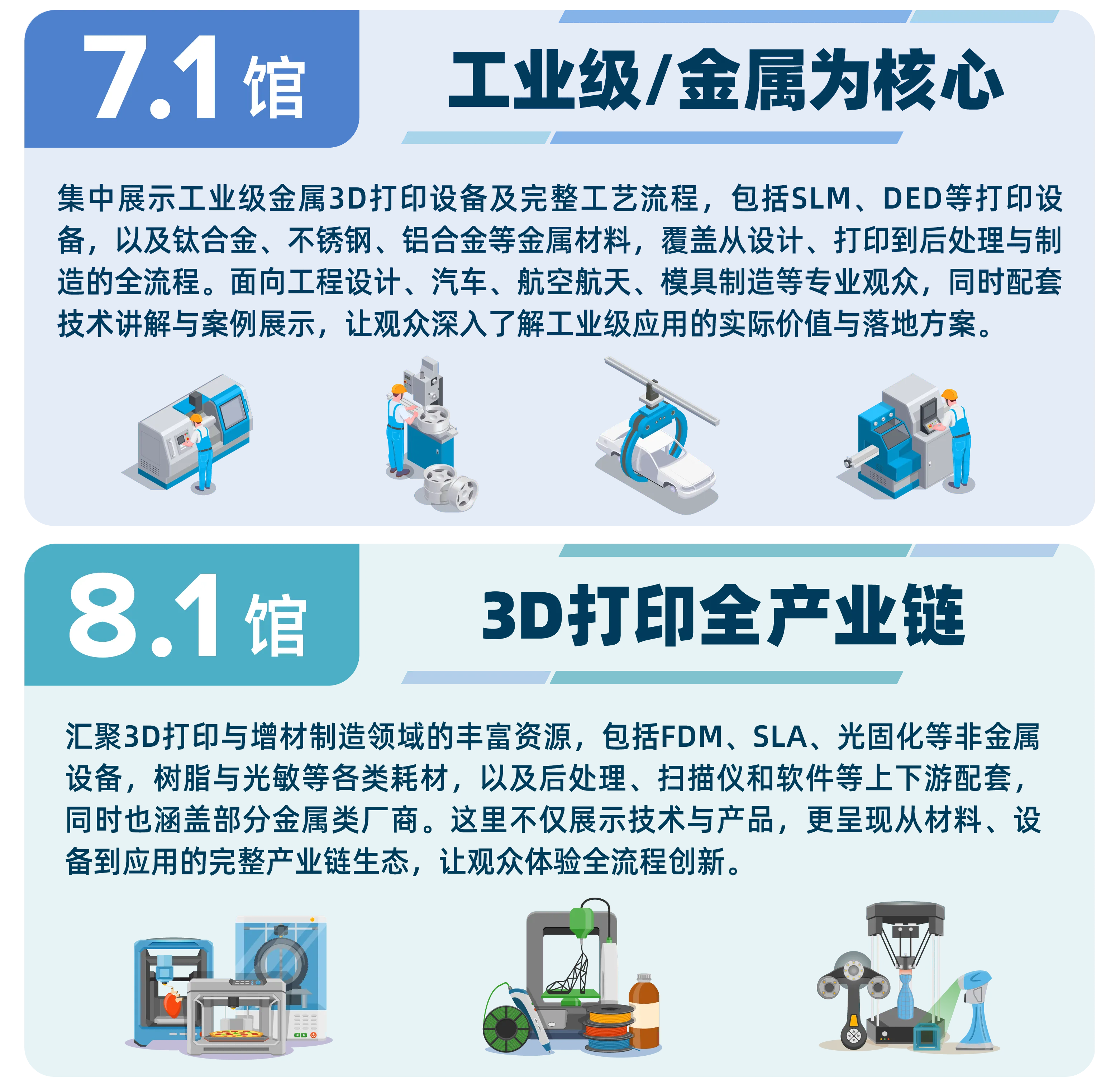 8.1号馆聚焦3D打印全产业链,汇聚:HP、嘉立创、先临三维、知象光电、思看科技、漫格科技、积木易搭、远铸智能、拓竹科技、原子重塑、创想三维、Elegoo、Snapmaker、Stratasys、美光速造、闪铸科技、Raise3D复志科技、盈普三维、起迪、纵横增材、潮阔科技、Formlabs、纵维立方、赛纳三维、黑格科技、奇遇科技、Polymaker、eSUN易生、拓博、摩方精密、爱丽兹、三绿、KEXCELLED、家联科技、博理科技、乾度高科、查克科技、Phaetus、纳维加特、Anisoprint、长江工研院、中纤三维、APLUS、海克斯康、精亮科技、元嘉生物、埃尔泰克等品牌。