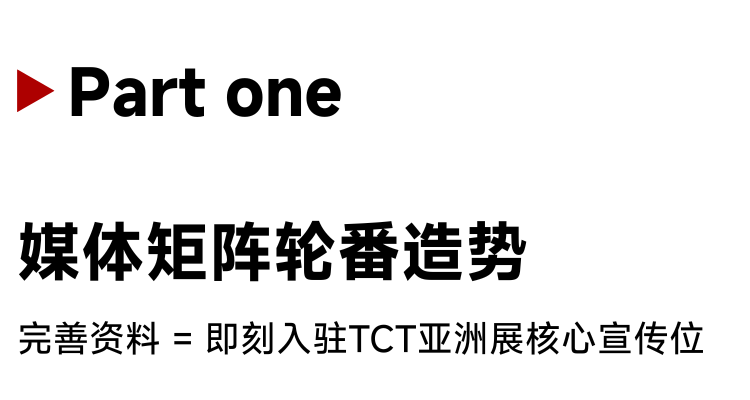 TCT亚洲展将贯穿整个展前周期与展期,为展商打造强而持续的宣传声量。无论是核心产品、技术故事还是首发新品,我们都将协助您将价值最大化呈现给最需要的人。