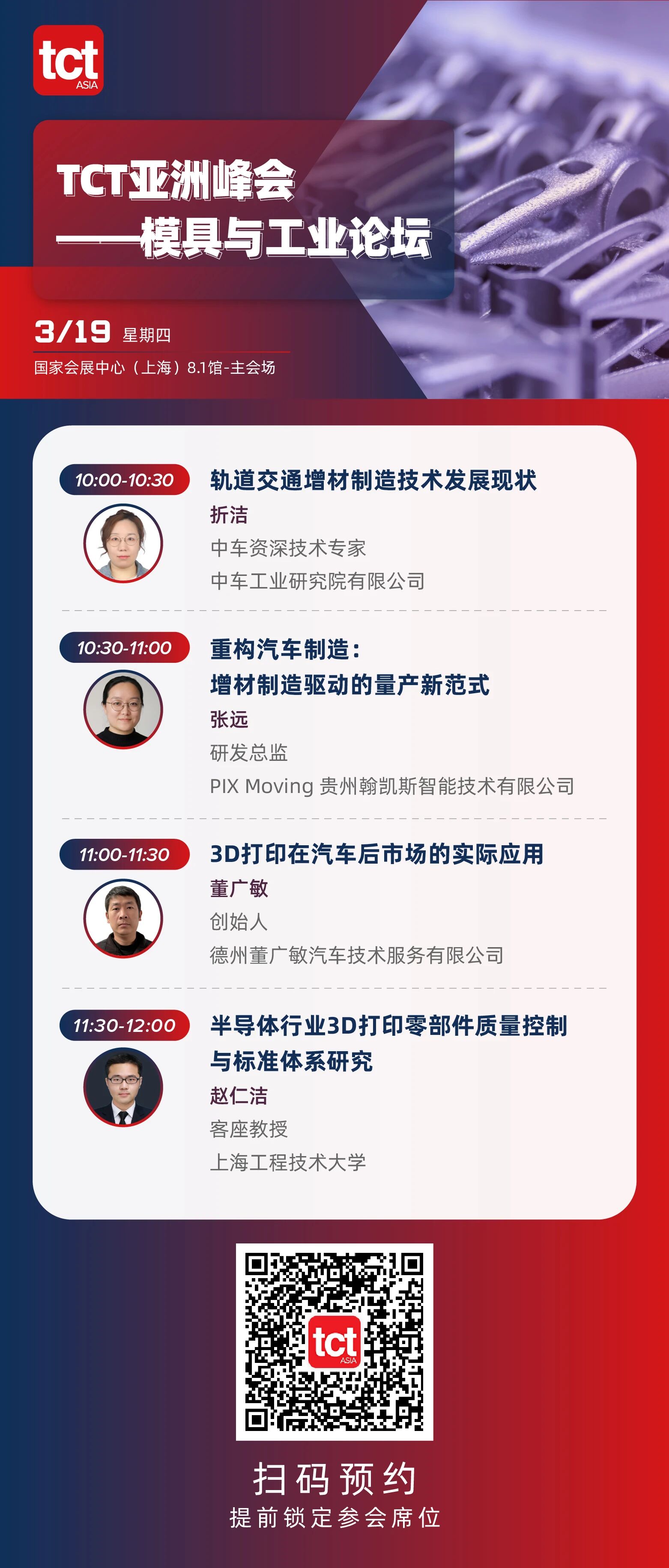 3月19日,TCT亚洲峰会——模具与工业论坛邀您共探工业进阶之路。这里不仅有前沿技术的头脑风暴,更有轨道交通、汽车制造、半导体等领军企业的实战经验拆解。