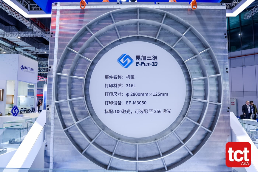 易加增材则延续了一贯的“激进路线”。尽管现场未展示实机,但他们发布的EP-M3050仍然引发广泛关注——最高可配置256激光,成型尺寸达到3058 × 3058 × 1200 mm,可直接制造如2.8米级316L不锈钢结构件这样的超大尺寸零件。这不仅是参数层面的突破,也在不断推高工业级3D打印的想象边界。
