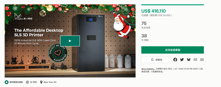 近日,科锐智能 (CREA,2026年TCT亚洲展:8C109) 旗下Loopzizo K-100桌面级SLS(选择性激光烧结)3D打印机正式登入知名众筹平台Kickstarter。K-100是一款紧凑型桌面SLS 3D打印机主打高性价比与专业级性能。截至12月25日,上线不到一周,众筹金额已超41万美元。