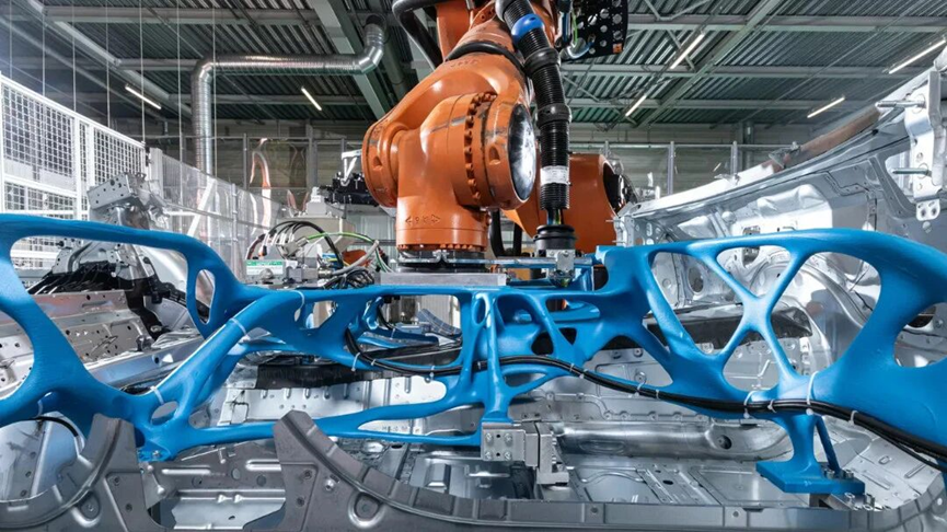 宝马公司每年3D打印超过40万个零件。去年,宝马展示了一个机器人夹具产品,使用3D打印夹具替代传统金属夹具,该夹具打印耗时22小时,重量仅150千克,比传统夹具轻约20%。