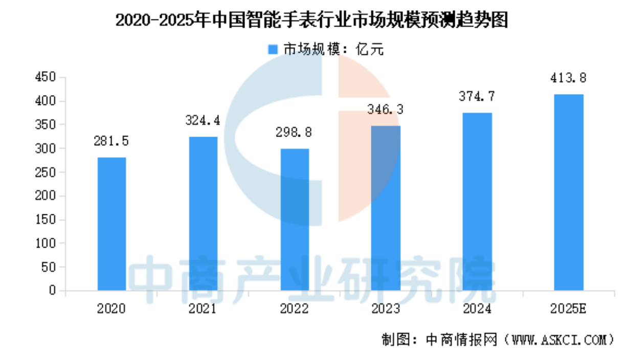 中商产业研究院发布的《2025-2030年中国智能手表分析及发展趋势研究预测报告》显示,2024年中国智能手表产量达到8095.4万个,2025年产量达到8500万个,市场规模将达到413.8亿元。而2025年全球智能手表预计出货量超过1.5亿个,市场规模为400-500亿美元。