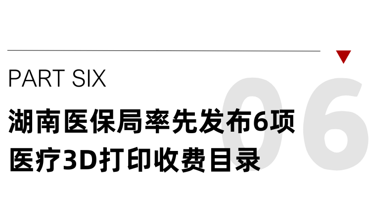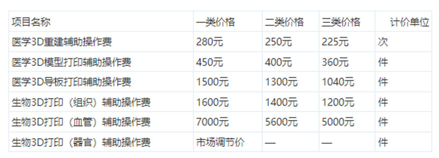 近日,湖南省医疗保障局发布《手术和治疗辅助操作类医疗服务价格项目公示》,将国家立项指南的6项3D打印目录悉数纳入,并明确了湖南的执行价格。湖南省根据医院等级分为三类价格标准("一类"为三甲医院,"三类"为基层医疗机构),3D打印相关收费如下: